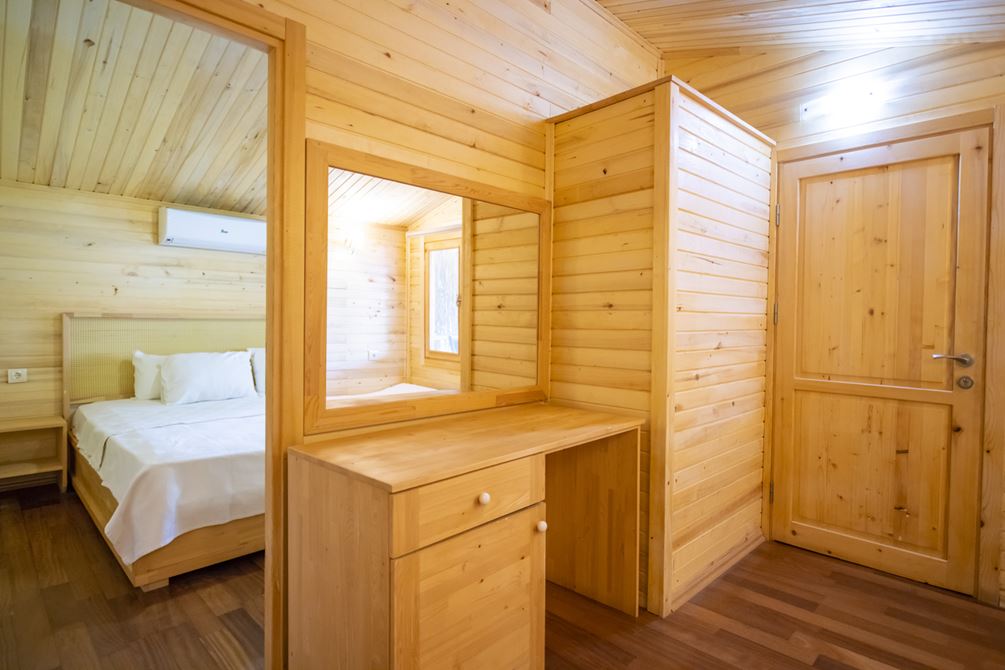 The bungalow family room consists of 2 separate rooms and is decorated in a modern style. Wooden furniture was used entirely in the decoration of the bungalows.