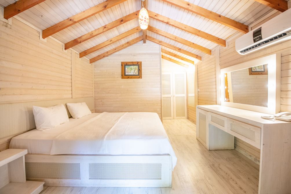 Standard bungalows are decorated in a modern style that matches each other. Wooden furniture is used in the decoration of the bungalows.